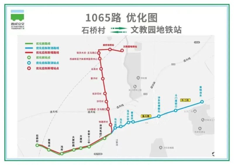 优化内容:线路调整后由“石桥村”始发,沿Y350路至王马路铁路附近后沿Y359路向北,行驶至王马路、镐京大道、“文教园地铁站”。