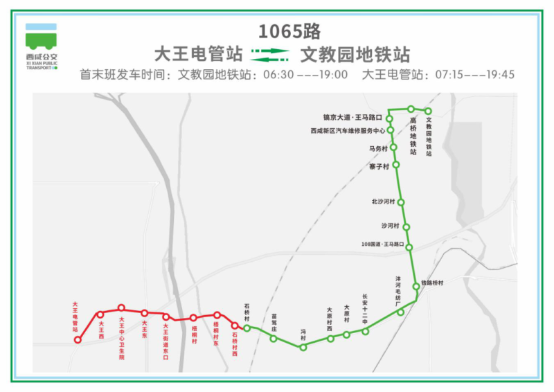 线路由石桥村沿西宝老线、咸余路延伸至大王街道(大王电管站)行驶,其余走向不变。新增石桥村西、梧桐村东、梧桐村、大王街道东口、大王东、大王中心卫生院、大王西、大王电管站8个站点。