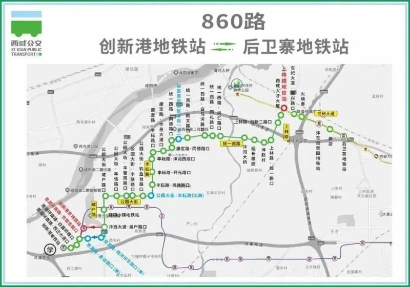 后卫寨地铁站至创新港地铁站方向:线路走向由思源环南路、沣西大道至“沣西大道 ·咸户路口”调整为由思源环南路、思源路、咸户路至“沣西大道 ·咸户路口”,新增思源路·金谷路口、思源路·南洋环东路口站2个站点,后续线路走向及途经站点不做调整。