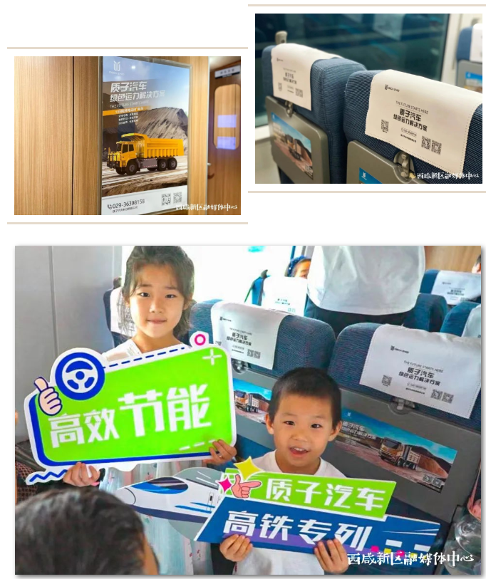 走进车厢,小桌板贴、车厢展板、头枕巾、行李架……到处都展示着质子汽车科技有限公司(以下简称“质子汽车”)的品牌LOGO、联系电话、企业信息二维码等内容,让沿线旅客可以全方位、多角度地了解该企业。
