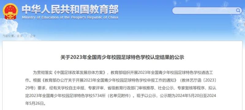 近日,教育部发布《关于2023年全国青少年校园足球特色学校认定结果的公示》,拟认定2023年全国青少年校园足球特色学校5734所。其中,西咸新区3所学校进入公示名单,公示期为2024年5月20日至26日。