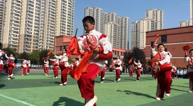 西咸新区沣东第一小学安塞腰鼓校队成员虽然年纪小,但在专业老师的指导下,刻苦训练,掌握了安塞腰鼓的击鼓技巧。他们在学校运动会开幕式、六一儿童节等活动中精彩亮相,身着鲜艳服装,迈着整齐步伐,敲打出充满活力的鼓点,为校园增添了热烈的氛围,展现出新时代小学生积极向上的精神风貌,也让更多人感受到安塞腰鼓的独特魅力。校队队员四年级四班的张琳钰兴奋地说:“每次敲起安塞腰鼓,我都充满了力量,那种热闹的氛围让我特别开心,我要把安塞腰鼓打得更好,让更多人知道中华优秀传统文化。”