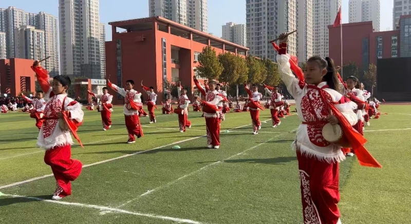 西咸新区泾河第一小学2023年9月建立腰鼓社团,现有高、低段参与学生400余人。每周二、周五课后服务时间进行腰鼓练习。通过安塞腰鼓的表演,展现了学生在传承非物质文化遗产方面的成就,赢得了社会各界的广泛赞誉,不仅展示了学生扎实的技艺,更传递了中华优秀传统文化的魅力。