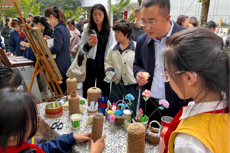 活动伊始,文教园第一小学的“桂花大道”变身开放式劳动成果展区。茶艺表演、寿司制作、麻绳编织、非遗缠花等十余个创意摊位前,学生们娴熟的技能和充满想象力的作品,让与会者频频驻足。