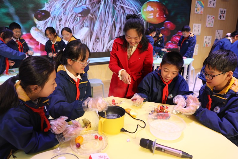 杜娇老师带来的《冰糖葫芦》则是一堂别开生面的英语劳动课。学生们在了解冰糖葫芦历史、学习相关英语表达的同时,亲手完成了熬糖、串果、挂糖的全过程。一堂课融合了语言学习、美食制作与文化传承,展现了“劳动+”课堂的无限可能。课后,一名学生举着自己的作品开心地说:“我回家要用英语教妈妈做冰糖葫芦!”