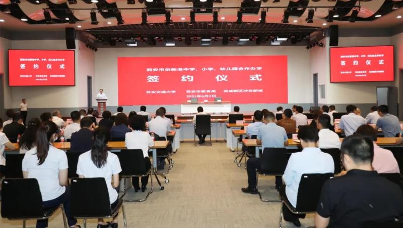 西安市教育局与西安交通大学签订创新港中学合作办学协议书,沣西新城管委会与西安交通大学分别签订创新港小学、幼儿园合作办学协议书,共同打造高标准、国际化、智慧化中小幼。
