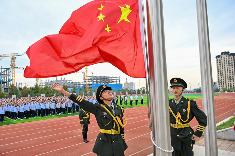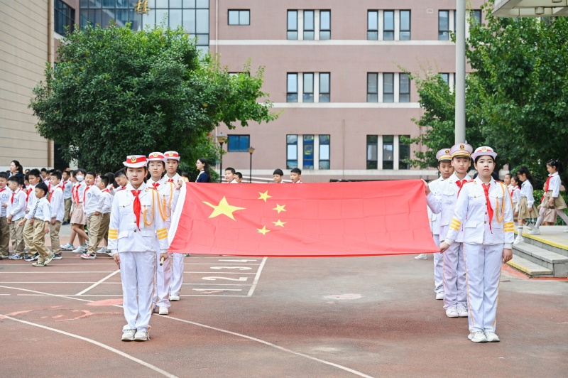 五星红旗迎风飘扬,雄壮嘹亮的国歌在校园里回荡,小小少年,目光炯炯,坚定理想,奋发向上。