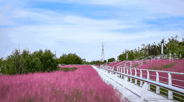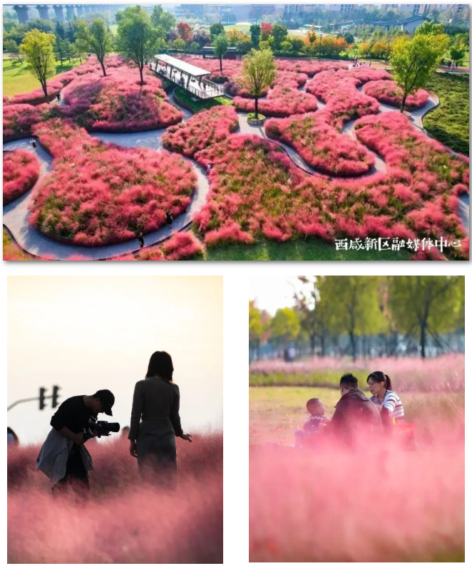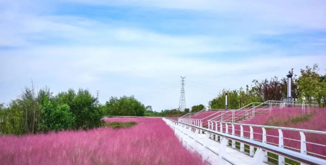 在秦汉新城渭河湿地公园,大片的粉黛乱子草同样抢眼正在盛放期的粉,在白色栏杆的“助攻”下搭建起秋日最佳拍照点,还可以带上风筝和孩子一起在绿道上放飞快乐,尽情享受亲子时光。