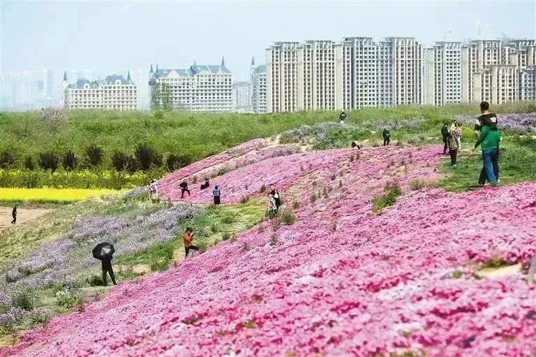 芝樱花盛开时,形状如同樱花色彩艳丽如同地毯,秦汉国际马术中心南,秦汉新城旅游路与飞龙路交叉口东有一片壮观的芝樱花海,百亩芝樱花粉紫桃红开得花团锦簇,随便一拍就是大片。