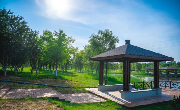 位于空港新城正平大街与自贸大道交叉口东南角,公园巧妙利用了交叉口绿化空间,5000平方米水域,2万平方米绿化面积,让这个口袋公园成为周边居民夏日纳凉休闲的好地方。