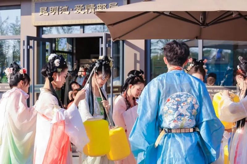 现昆明池景区联合诗经里小镇,推出汉服轻松租借、异地归还、免费补妆等服务,游客朋友们可凭消费凭证就近选择昆明池爱情邮局或诗经里思路华服点位,租赁、归还汉服,还可免费补妆,时刻保持完美状态。