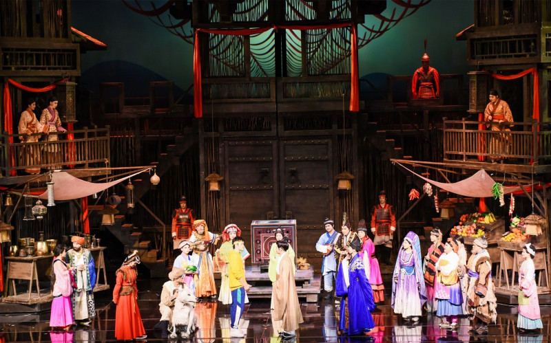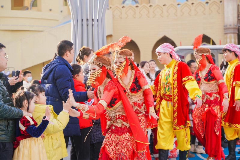 《丝路之声》演员们现身丝路欢乐世界地标建筑,i Tower爱之塔下,将音乐剧带至室外,欢快的歌声和绚丽的舞姿引得游客们纷纷驻足欣赏,演员们与游客亲密互动送上新春祝福。