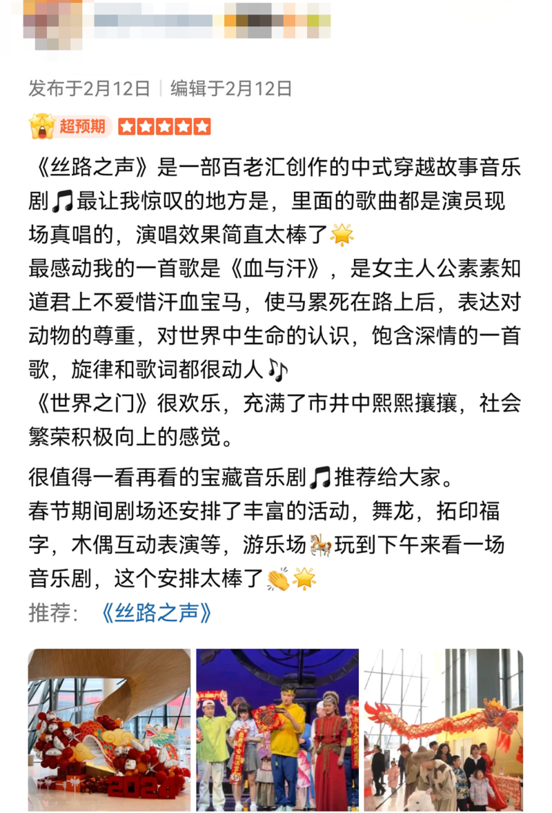伴随着观众的欢呼声,《丝路之声》在龙年春节假期开启双场模式,正月初一至初八,每日两场演出轮番上演,观众在精致的布景、完美的演绎中,通过艺术的力量感受丝路文化的独特魅力,演出现场座无虚席、掌声连连,观众与演员的热情互动将欢乐的节日气氛拉满。