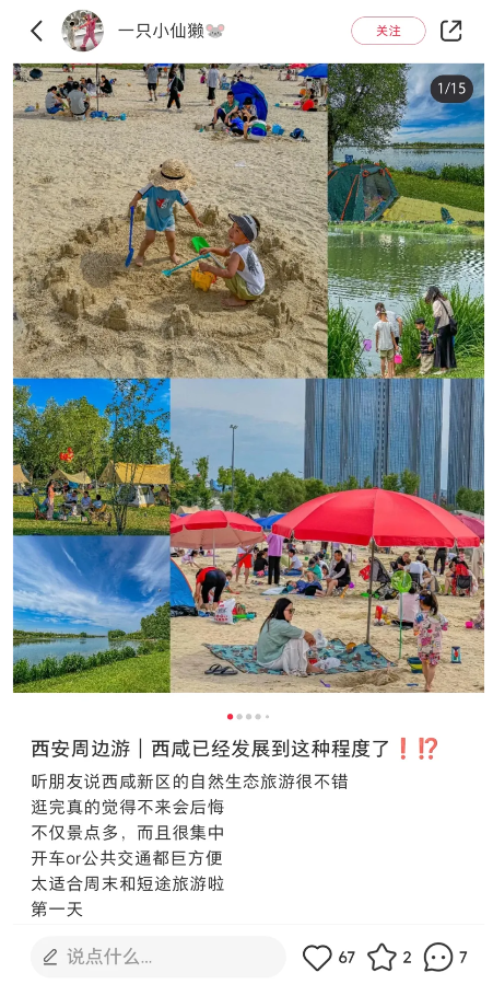 达人“星星不黛露”最中意的是能源金贸区的金湾白沙滩。她说:“这里简直就是西安人自己的‘小马尔代夫’”,而且滨河生态公园里绿树成荫,鸟语花香,也是露营、骑行的不二之选。云间花境看飞机拍花海遛娃露营一条龙,也给她留下深刻印象。