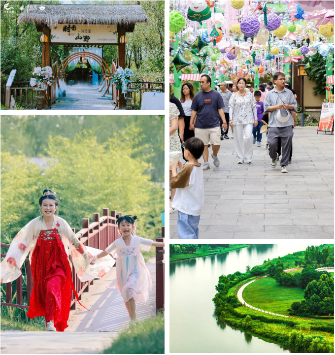 当然,来诗经里的游玩方式不止于此。早上,你可以身穿汉服,漫步在小镇的大街小巷,两旁古色古香的建筑仿佛带你穿越回千年前的风雅颂时代,手工染制的工艺品、非遗体验等项目更是能让你深刻感受到传统文化的魅力。夕阳西下,沿着6.8公里的沣河绿道骑行,道路两旁绿树成荫,空气清新,如果累了,就停下来在观鸟台上歇歇脚,看看沣河美景,听听鸟儿欢唱,和大自然来一场亲密约会。