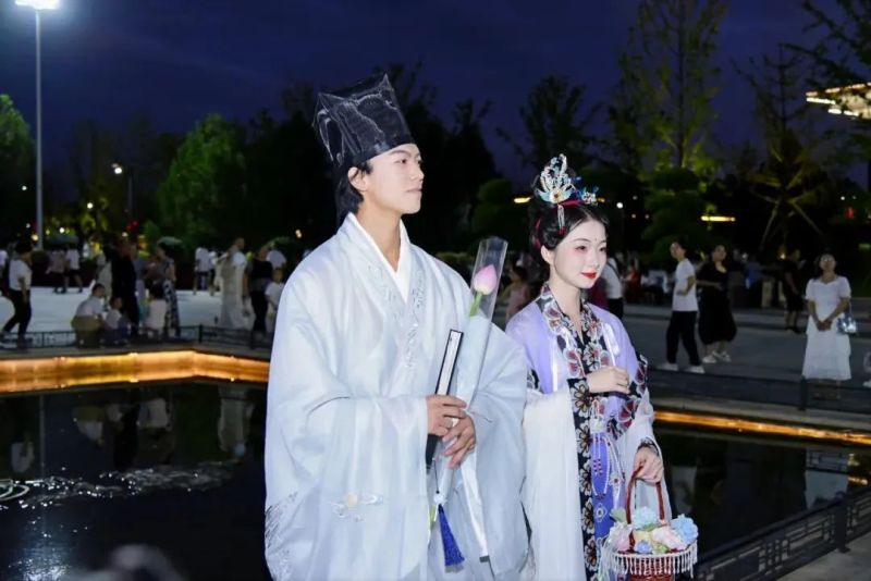 穿越千年从画卷中走来的卖花郎,挑一担夏荷,为大家带来夏日浪漫。现场与游客通过答题、对诗歌、唱歌、讲故事等活动吸引游客参与。