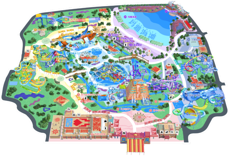 欢乐水寨也值得一去,在这里孩子们可以爬高上低,不定时迎接大水桶的“降温大冲刷”。再往西走,玛雅水工厂有休闲放松的区域,躺在这里享受清凉也是不错的选择。