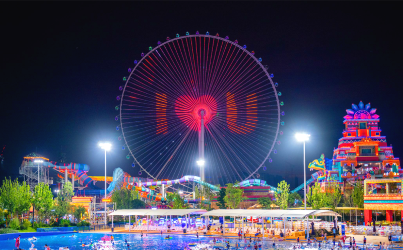 待夜幕降临走出园区,西北最大的OCT摩天轮已经亮起灯光。乘上智能音乐轿厢,在高高的摩天轮上俯瞰玛雅海滩全貌,拍照打卡十分温馨。