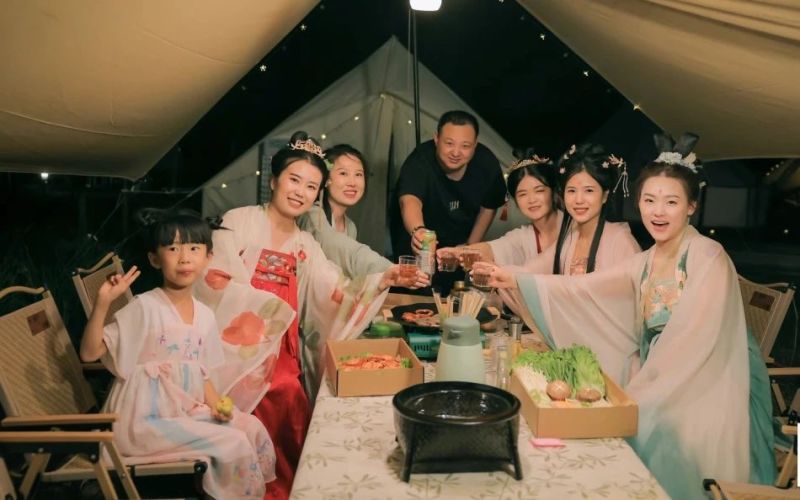 扎好帐篷,先来一顿热辣鲜香的火锅点燃氛围,再来一场围炉煮茶消食解腻,炉边别忘放上红薯,再烤上一把花生。炭火闪烁,茶香渐浓,红薯被烘得甜香四溢,花生也被烤得焦香诱人。大家一起品茗聊天,在蓝天下留下欢声笑语。