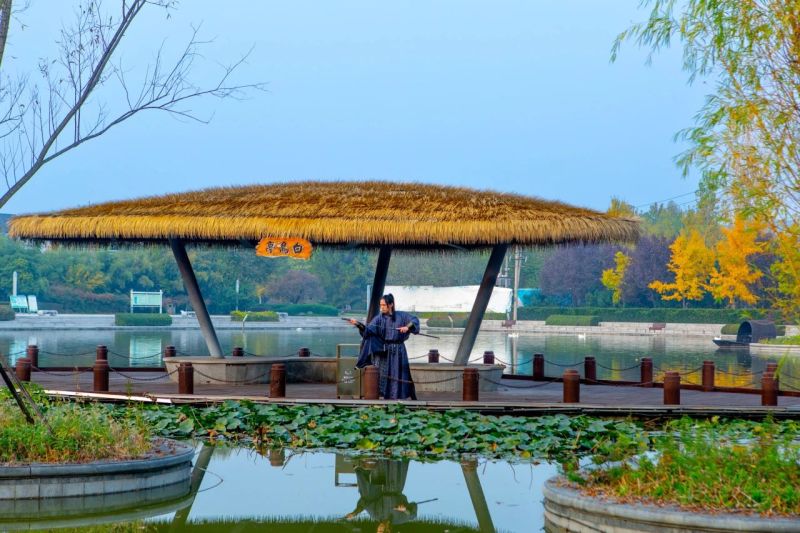 同样位于沣东新城的昆明池·七夕公园,进入初冬时节则别有一番意趣。冬日的阳光下,湖水潋滟,金鳞跃动,岸边树木金黄,一幅唯美的初冬画卷就在这里徐徐展开。