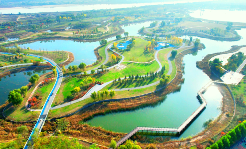 初冬时节,沣东新城沣河生态湿地公园的树木已是色彩斑斓,草地却依旧绿意盎然。