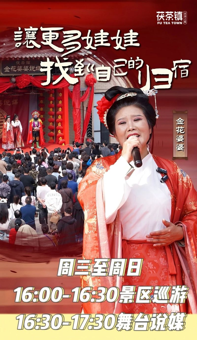金花婆婆、茯冰人等组成巡游队伍在茯茶镇景区水系及二期直营街全阵容集结,与游客现场互动、对诗互动。说媒现场,金花婆婆将以独有的智慧与幽默,为单身的朋友们牵线搭桥,只要年满18周岁的单身青年现场均可免费报名参与。