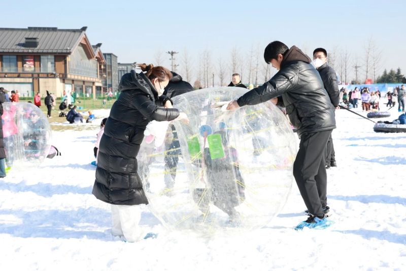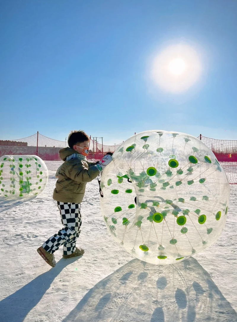 在雪地上,和家人、朋友一起“穿上”充气碰碰球,尽情碰撞、旋转,不仅能锻炼协调性和体力,更能带来无穷的欢笑与刺激。