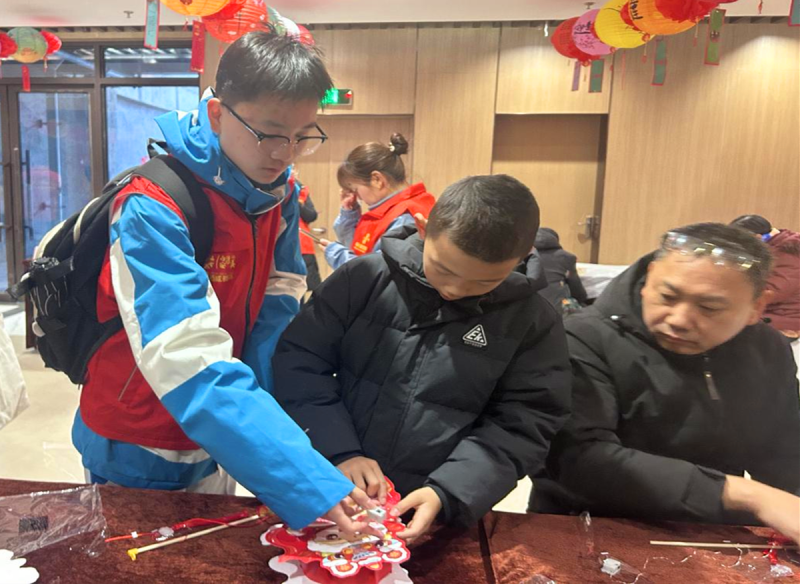 在西咸新区窑店街道秦苑七路社区,孩子们在工作人员的指导下手制灯笼。经过仔细剪裁、拼贴,一盏盏花灯在孩子们的手中诞生。在另一边,五彩斑斓的小灯笼高高挂起,喜庆的灯谜映入眼帘,内容涵盖历史典故、诗词歌赋、生活常识等,趣味十足。