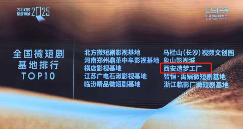 近日,在“光影双辉・星耀鹏城2025”第十四届中国国际新媒体短片节上,位于西咸新区沣西新城的西安造梦工厂影视基地登陆“金鹏指数”微短剧新质榜,并成功入选“金鹏指数・2024年全国微短剧基地排名TOP10”,这也是陕西省唯一入围的基地。