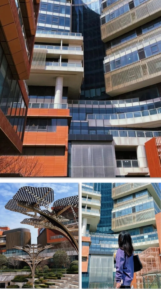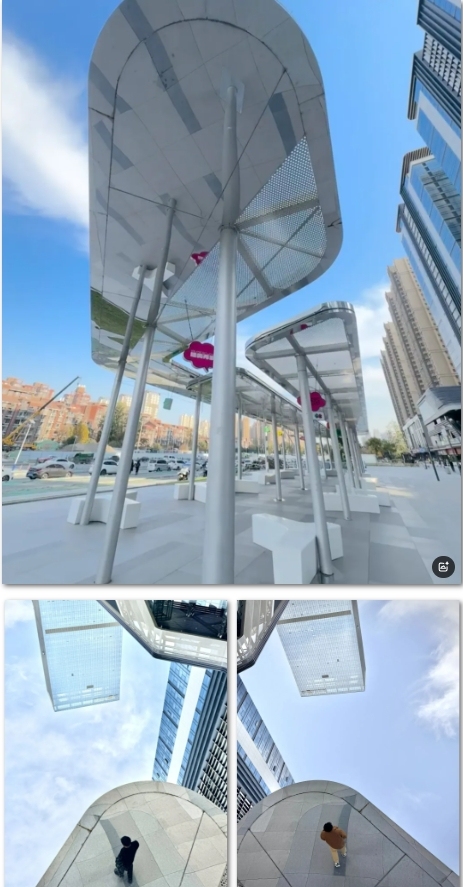 谁说街区的休憩区只能用来休息?这里的阳光透过玻璃幕墙,与现代化建筑群交相辉映,折射出迷人的光影效果,仿佛一座未来之城。