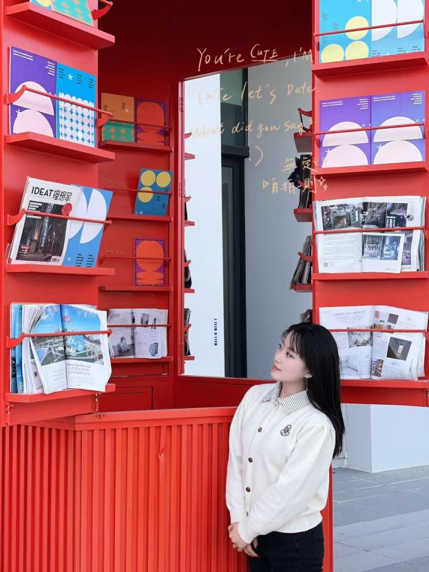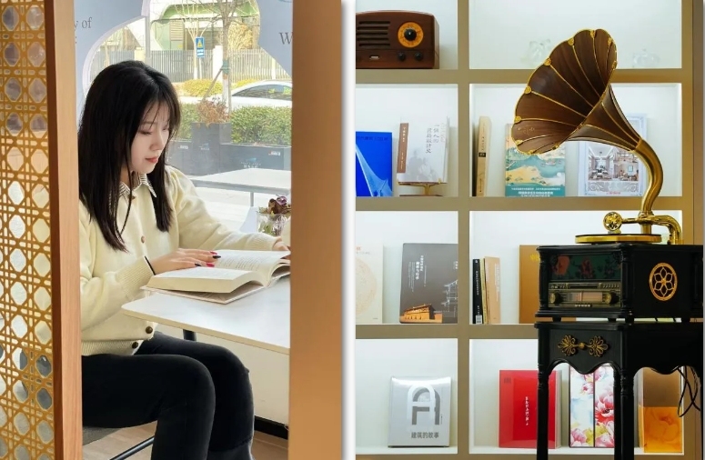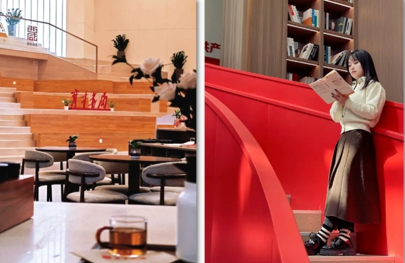 室外书亭适合浅色系衣服,搭配午后斜阳,温暖而又治愈;室内书吧走廊纵深设计,与极简风超配。