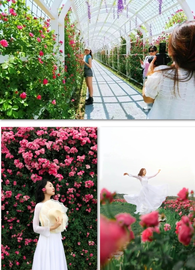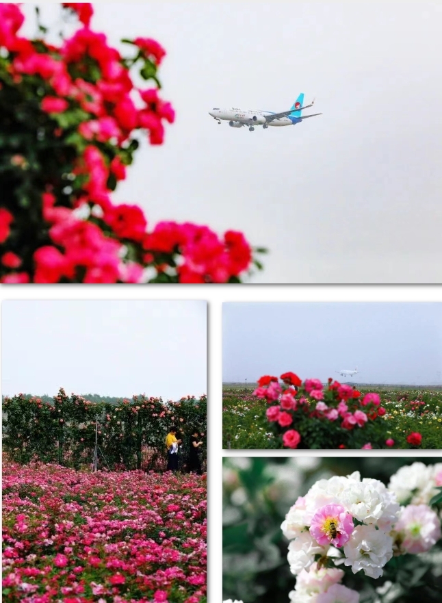 重点来了。这里抬头能看到飞机划过湛蓝天空,俯身就是随风摇曳的花海。尤其是黄昏时分,月季被染成金色,飞机变成剪影,伴着温柔晚风,随便按下快门,都是氛围感满满的大片,绝对是拍照打卡的绝佳时刻。想在朋友圈“出圈”,就来这儿拍。