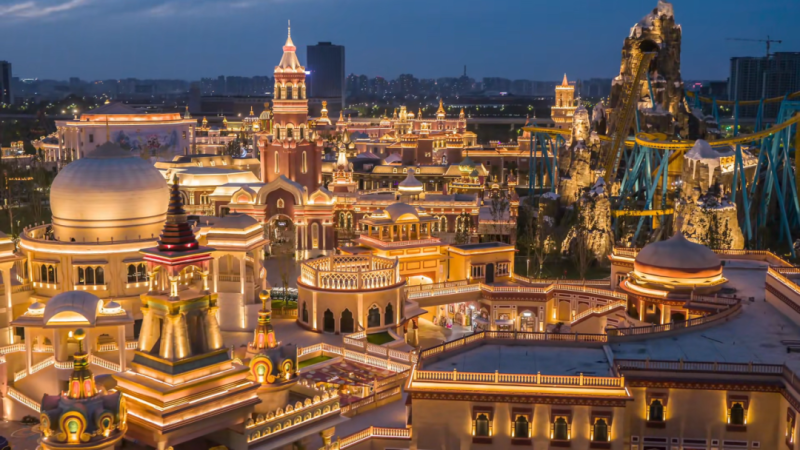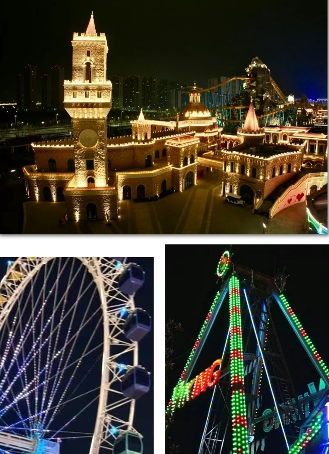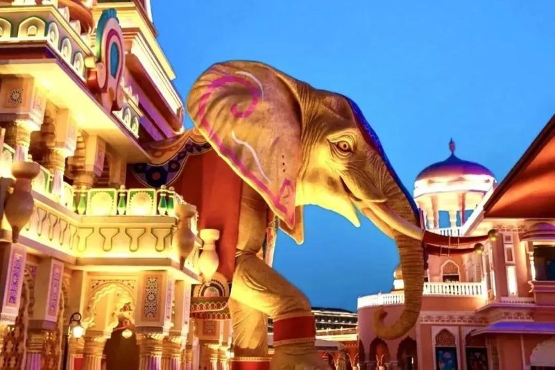 当夜幕降临,热浪褪去,丝路欢乐世界迎来高光时刻。爱之塔熠熠生辉,七大主题街区在精心设计的灯光映衬下,呈现出迷人的异域风情。