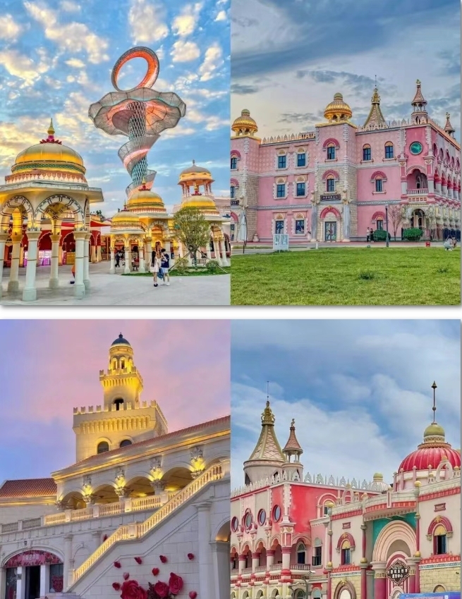 这座以丝路文化为主题的乐园分为七个异域风情街区。园区中,荣耀罗马区的糖果城堡、阳光希腊的蓝白建筑、恒河象谷区的黄金城漂流最出片,日落黄昏乘坐漂流船感受独有的蓝调时刻,仿佛整个世界都安静下来了。