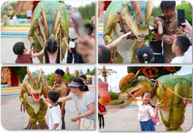 针对亲子家庭,园区还设置了亲子互动课堂。小朋友可以和驯养师共同牵引小型恐龙巡游,亲手触摸仿真皮肤,在玩耍中了解古生物知识,开启一场有趣的科普启蒙之旅。