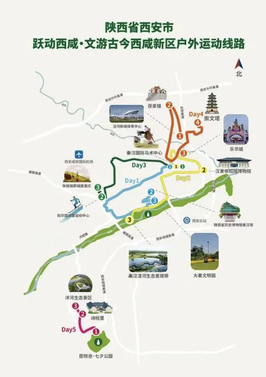 该线路深度融合历史与自然景观,沿途可游览陕西历史博物馆秦汉馆、汉阳陵,欣赏秦汉新城渭河生态景观带、沣河景区的自然风光,体验茯茶镇的特色美食。线路上的户外运动项目丰富多元,包含马术、滑雪、桨板等专业运动,以及骑行、露营、垂钓等休闲活动。