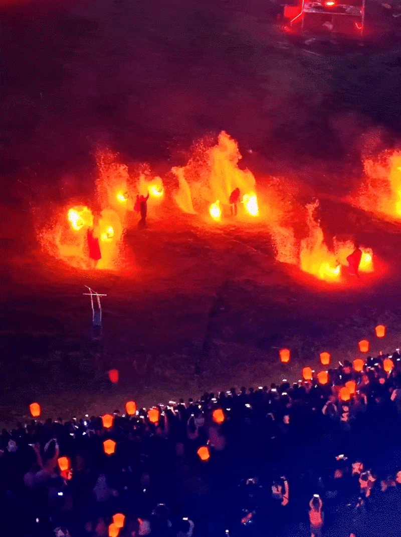夜幕降临后,灵沼湖畔的非遗表演更是惊艳。打铁花在夜空绽放,金光闪闪的花火刚好呼应唐诗里“繁光远缀天”的意境;水上火壶表演更绝,燃烧的火焰化作“火链”在水面挥洒,光影交错间,中式浪漫有了具体的形状。