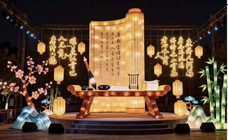 剪纸、皮影这些非遗元素都被藏进了花灯里。一盏盏花灯错落有致,亮起时暖光漫溢,裹着千年民俗的烟火气,瞬间唤醒小时候盼着过年的欢喜感。