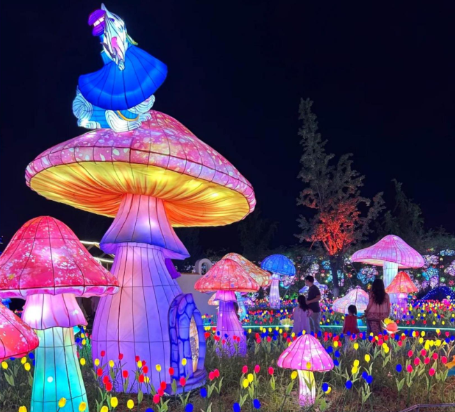 可爱的蘑菇精灵灯组散落在角落,搭配错落的氛围树挂,童趣十足;“十里麦香花开一路”地面灯组更是惊艳,灯光流转时,像金色麦浪与绚烂花海交织,浪漫又有生机。