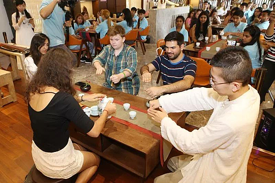 来自巴西的拉斐尔 ,则是一名资深中国功夫爱好者。在太极拳表演环节中,他跟随着台上太极“小教练们”认真学着太极拳一招一式 ,体会着刚柔并济的中国智慧。“我很迷恋太极拳!”,拉斐尔说中国功夫对他来说有着独特的魅力。台上“小教练”认真展示一招一式,台下大学生们学的有模有样。短短数十分钟,太极中所呈现的“动之则开,静之则合”似乎能够略见一二。“打的漂亮”,周围游客也对他们的精彩表现竖起了大拇指。