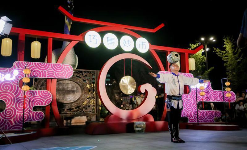 在池望广场,皮影戏、顶缸及双人杂技等非遗演出,古风发饰、穿针乞巧及扎染等售卖摊位,尽显乞巧节的巧思妙趣,现场吆喝声、掌声与市集灯火交相辉映,营造出浓厚汉代市井氛围,游客不仅可以欣赏到景区夜晚热闹的美景,还能感受原汁原味的非遗文化以和汉文化。