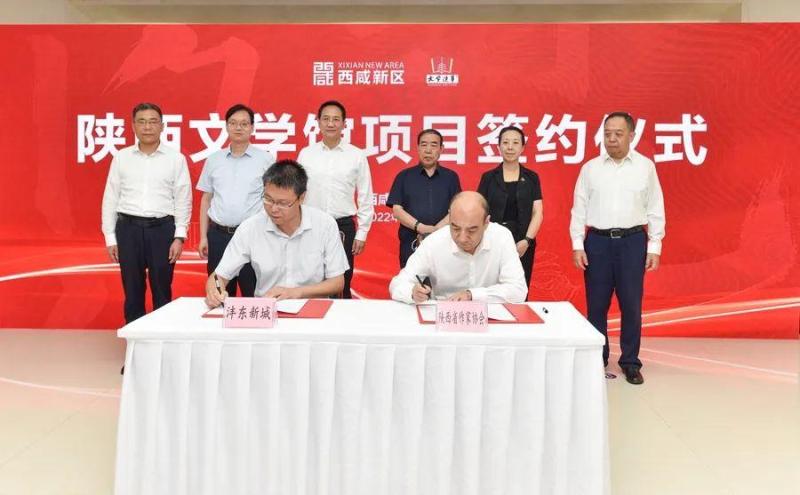 省作协党组成员、主席贾平凹,省作协党组书记、常务副主席齐雅丽,省作协秘书长王晓渭,西咸新区党工委书记杨仁华,西咸新区管委会主任姜建春,西咸新区党工委委员、沣东新城党委书记、管委会主任姚海军出席仪式并见签,沣东新城党委委员、管委会副主任马建昌,省作协党组成员、副主席安广文分别代表西咸新区沣东新城、陕西省作家协会签订陕西文学馆项目战略合作协议。西咸新区党工委委员、管委会副主任艾晨主持签约仪式。