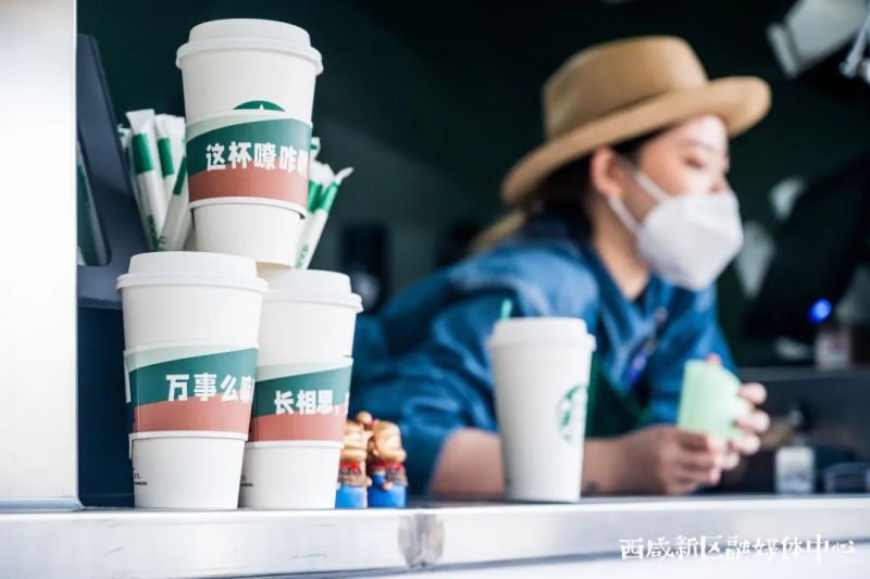 咖啡车还为顾客们准备了“星”意十足的礼品。每天前50名消费的顾客可以收到限量版关中方言杯套,“这杯嘹咋咧”“万事么嘛哒”,这些“老陕味”十足的文案让人倍感亲切。此外,任意消费的顾客还可以参与扭蛋机抽奖。