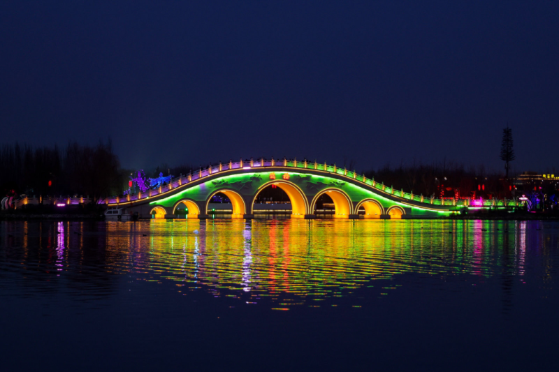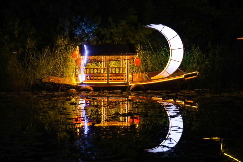 夜幕下的鹊桥上,点点浪漫的星光,约上三两好友,乘着夜色坐着摇橹船享受自然与美景,或在湖边的亭间小坐看水波衬着明月,衬托出一片温柔静谧的浪漫夜景。