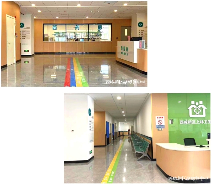 上林街道卫生院(新院)位于西咸新区沣东新城,丰弘路与上林路交汇处,沣林桥西侧,新院建筑主要分为综合楼和发热门诊楼两部分,内部环境干净整洁、明亮宽敞,致力于为就医群众带来更好的服务体验。