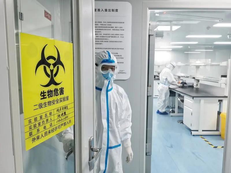 风东实验室核酸检测员肖磊正在进入实验室,入口处的标志非常醒目。