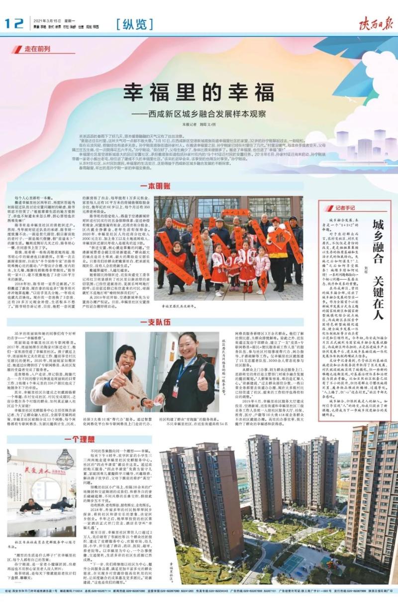 今天,陕西日报整版刊发《幸福里的幸福——西咸新区城乡融合发展样本观察》,聚焦新区致力打造办事便捷、交通便利、生活多彩的社区生活圈,持续提升公共服务品质,满足更加丰富多元的需求,让群众过上幸福生活。