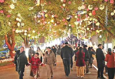 湖北当阳玉泉山风景区举办2025新春繁花灯火艺术节,游客们在参观游览。