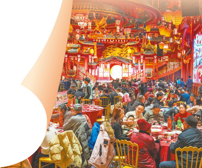 安徽芜湖市繁昌区一家酒店内,顾客们在吃年夜饭。
