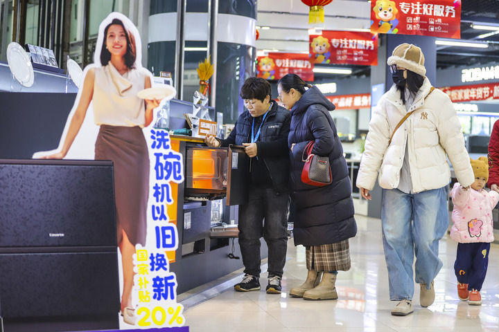 2025年1月8日,顾客在山东省青岛市李沧区李村街道一家商场选购洗碗机。新华社发(张鹰 摄)